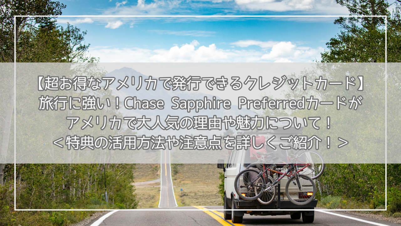 こんにちは!2022年からイリノイ州に夫婦で住んでいて、夫婦で計22枚のアメリカでクレジットカードを作成しました。アメリカでは日本と比べ物にならないくらいお得なクレジットカードが沢山あります!今回は大人気のChase Sapphire Preferredカードの魅力点や特典の活用方法、注意点を詳しくご紹介したいと思います!何かご質問等がございましたら、気軽にこちらもしくはInstagramのDMよりメッセージいただけたらと思います。