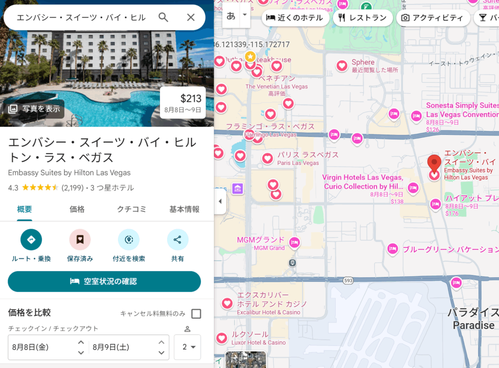 Las Vegasにある、Embassy Suites by Hilton Las Vegasに宿泊しました!例えば、8月の金曜日の夜だと、1泊213ドルのところ5.5万ポイントで宿泊可能です!ずっと滞在したかったこちらのホテルに無料で宿泊出来てとても嬉しかったです!オムレツなど個別でオーダーできる朝食があったり、夜(17時から19時まで限定)はバーで無料で2杯ほどのドリンクとスナックなどの軽食を無料でいただけます!ビリヤードやジャグジー、プールもありました!
