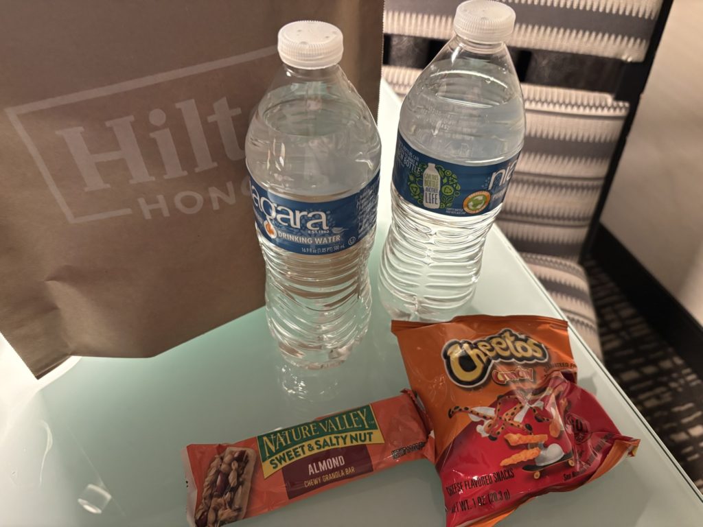 下記で紹介してるラスベガスで滞在したエンバシースイートのホテルは全員朝食無料だったので、スナックとボトルウォーターを頂きました。詳細はホテル予約前後やチェックイン時に確認されることをお勧めします!