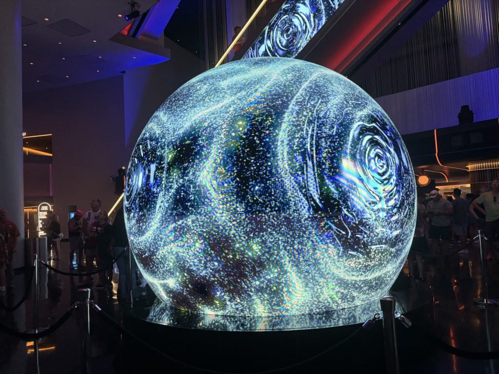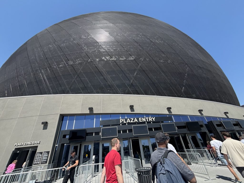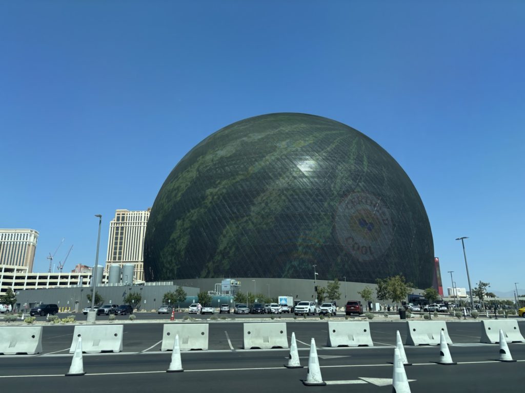 Sphereは2023年にオープンした、ラスベガスの最新スポットです。外観は巨大な球体で、夜になると全面がLEDスクリーンになり、表情を変えます。近未来的で、遠くからでも目を引く存在です。