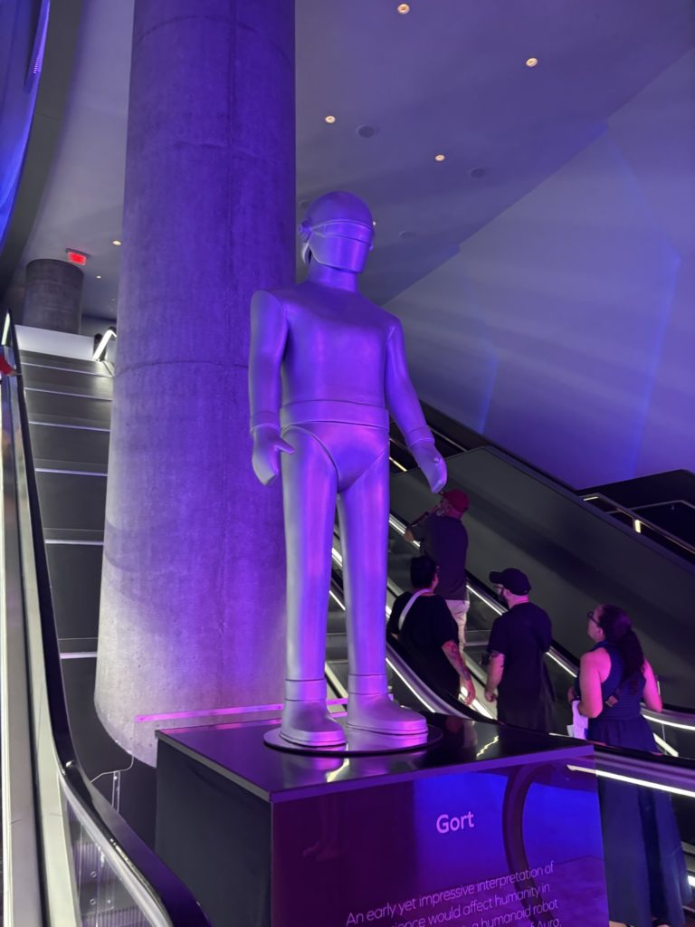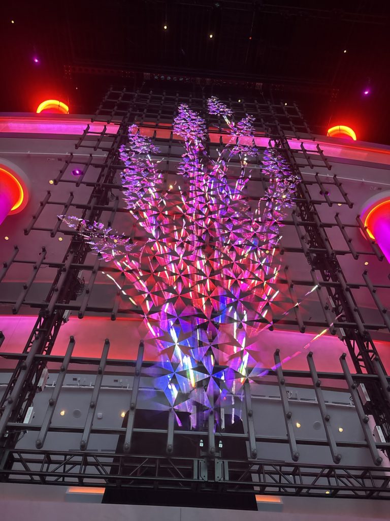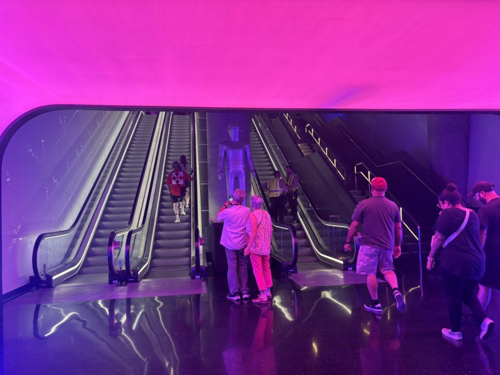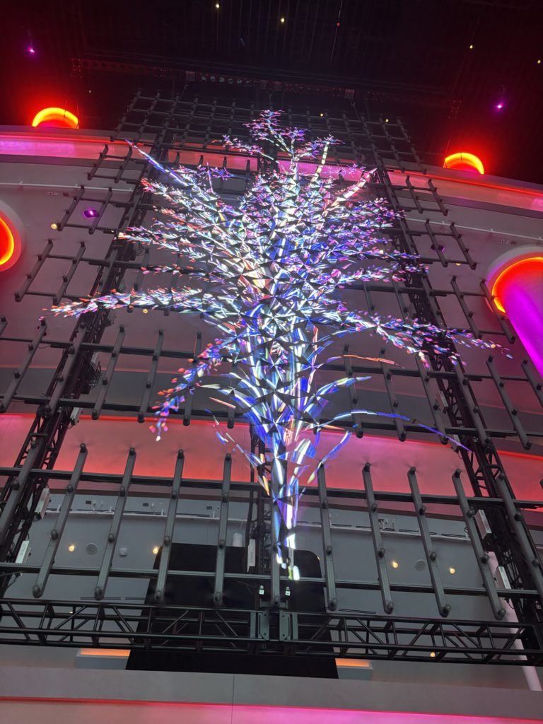 Sphereが人気なのは、世界初の「16KラップアラウンドLEDスクリーン」を備えているためです。館内に入ると、頭上から足元までぐるりと高精細映像に包まれ、まるで映画の世界に入り込んだかのような体験ができます。音響も革新的で、座席ごとに調整されたビームフォーミングスピーカーが設置されており、どこに座ってもクリアで迫力ある音が楽しめます。