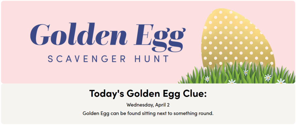 Each day, we’ll share a daily clue in store, on our site and on our social media channels. Use the clue to help you find a Golden Egg game piece and you could receive a reward.